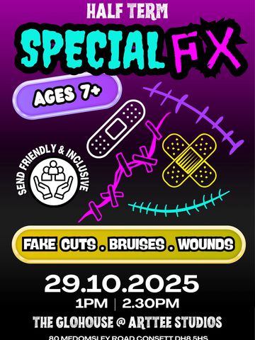 Intro to SFX make-up! Learn to create realistic cuts, bruises, and wounds in a SEND-friendly, inclusive environment. Have fun designing your own spooky look and finish with a mini photoshoot to show off your creations!